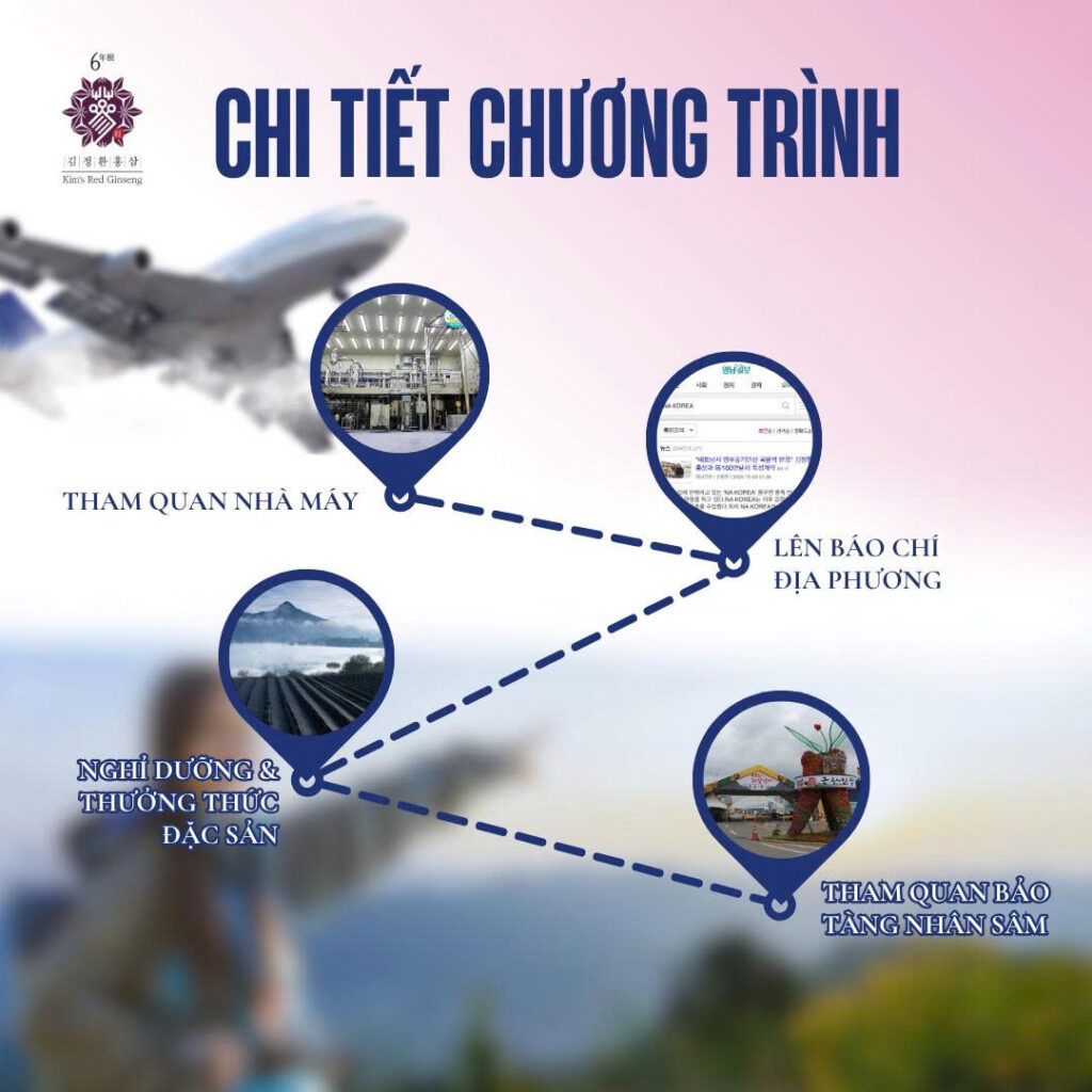 Trong chuyến hành trình tại Hàn Quốc, quý đối tác sẽ được tham dự lễ ký kết trang trọng với các đối tác Hàn Quốc, góp phần nâng tầm uy tín thương hiệu cá nhân; tham quan nhà máy sản xuất hiện đại, trải nghiệm quy trình tạo nên những sản phẩm chất lượng hàng đầu; xuất hiện trên báo chí địa phương để tăng độ nhận diện và củng cố hình ảnh chuyên nghiệp trên thị trường. Bên cạnh đó, quý đối tác còn được nghỉ dưỡng và thưởng thức đặc sản vùng Punggi – thủ phủ nhân sâm nổi tiếng của Hàn Quốc, tham quan Bảo tàng Nhân Sâm để tìm hiểu lịch sử hàng trăm năm của loại thảo dược quý, và giao lưu với các nhà phân phối Hàn Quốc nhằm mở rộng cơ hội hợp tác kinh doanh trong tương lai.