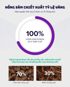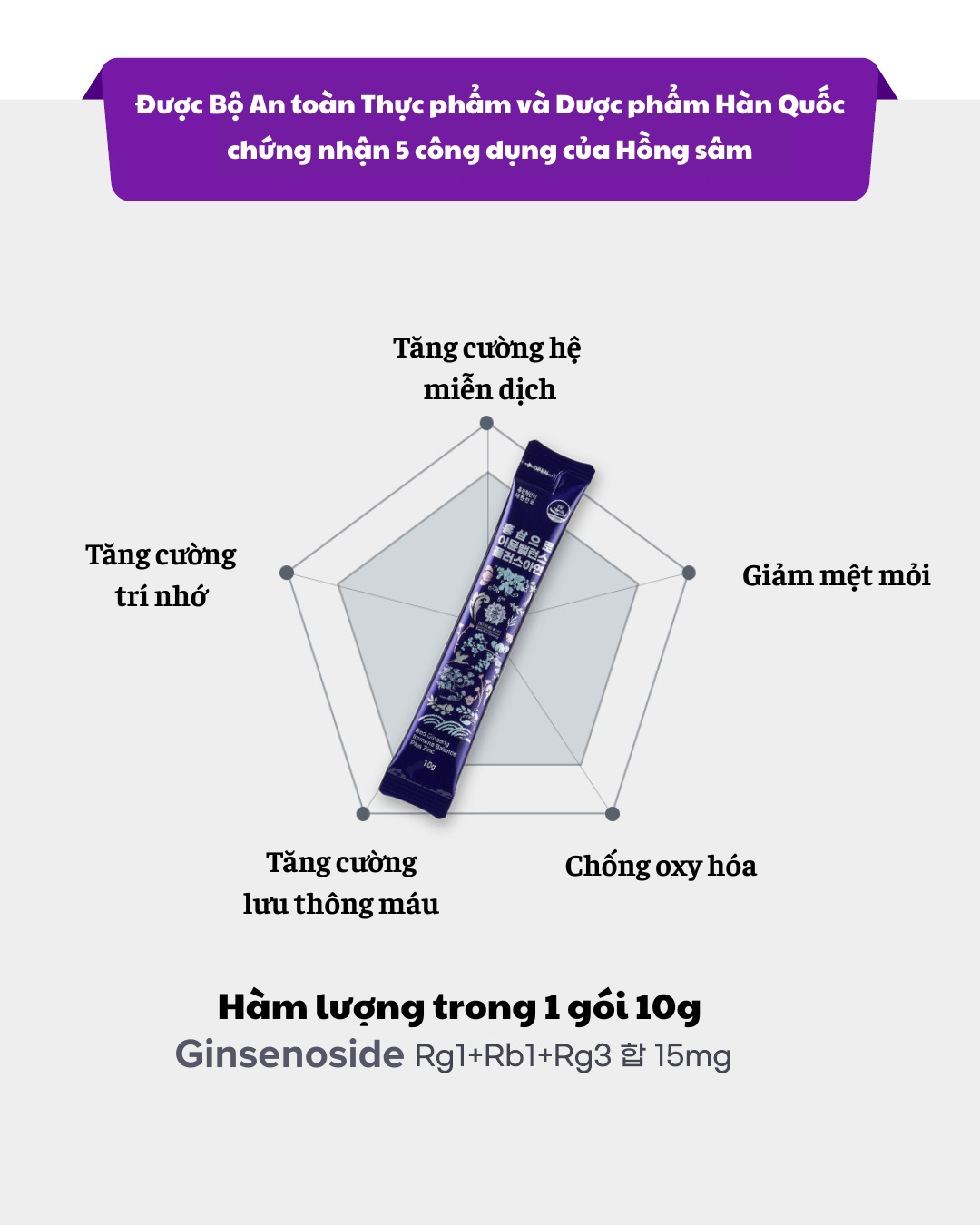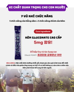 Sản phẩm là sự kết hợp của 5 công năng từ Hồng sâm (đã được Bộ ATTP Hàn Quốc chứng nhận) và 2 công năng từ Kẽm: